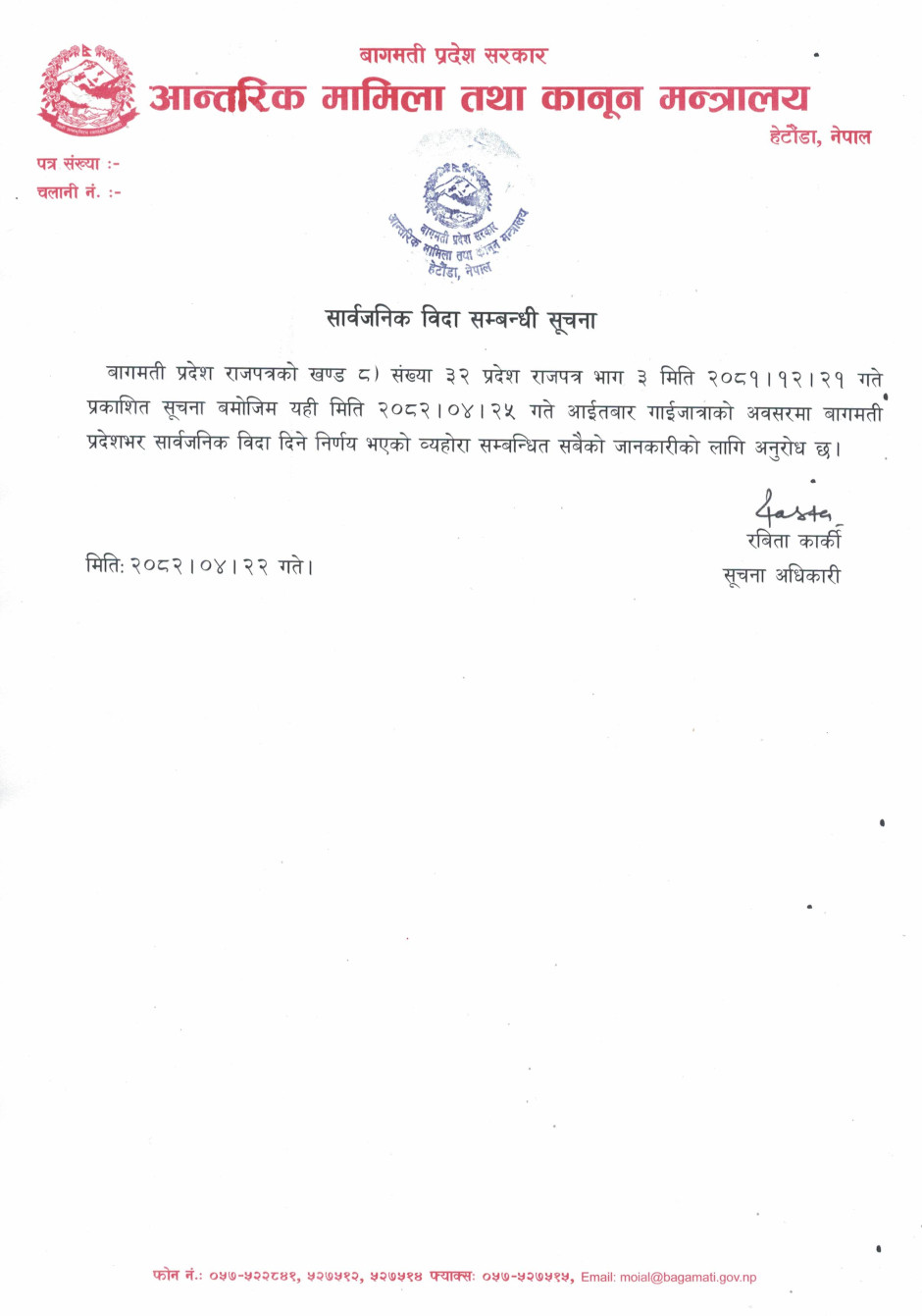 आन्तरिक मामिला तथा कानून मन्त्रालय, हेटौंडाको सार्वजनिक विदा सम्बन्धी सूचना !