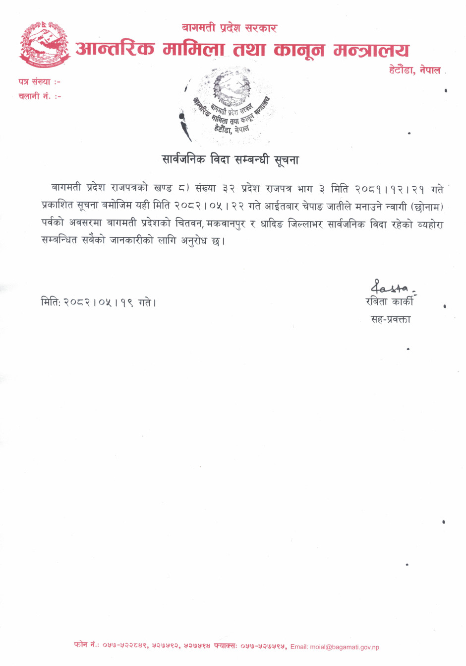 आन्तरिक मामिला तथा कानून मन्त्रालय, हेटौंडाको सार्वजनिक विदा सम्बन्धी सूचना !