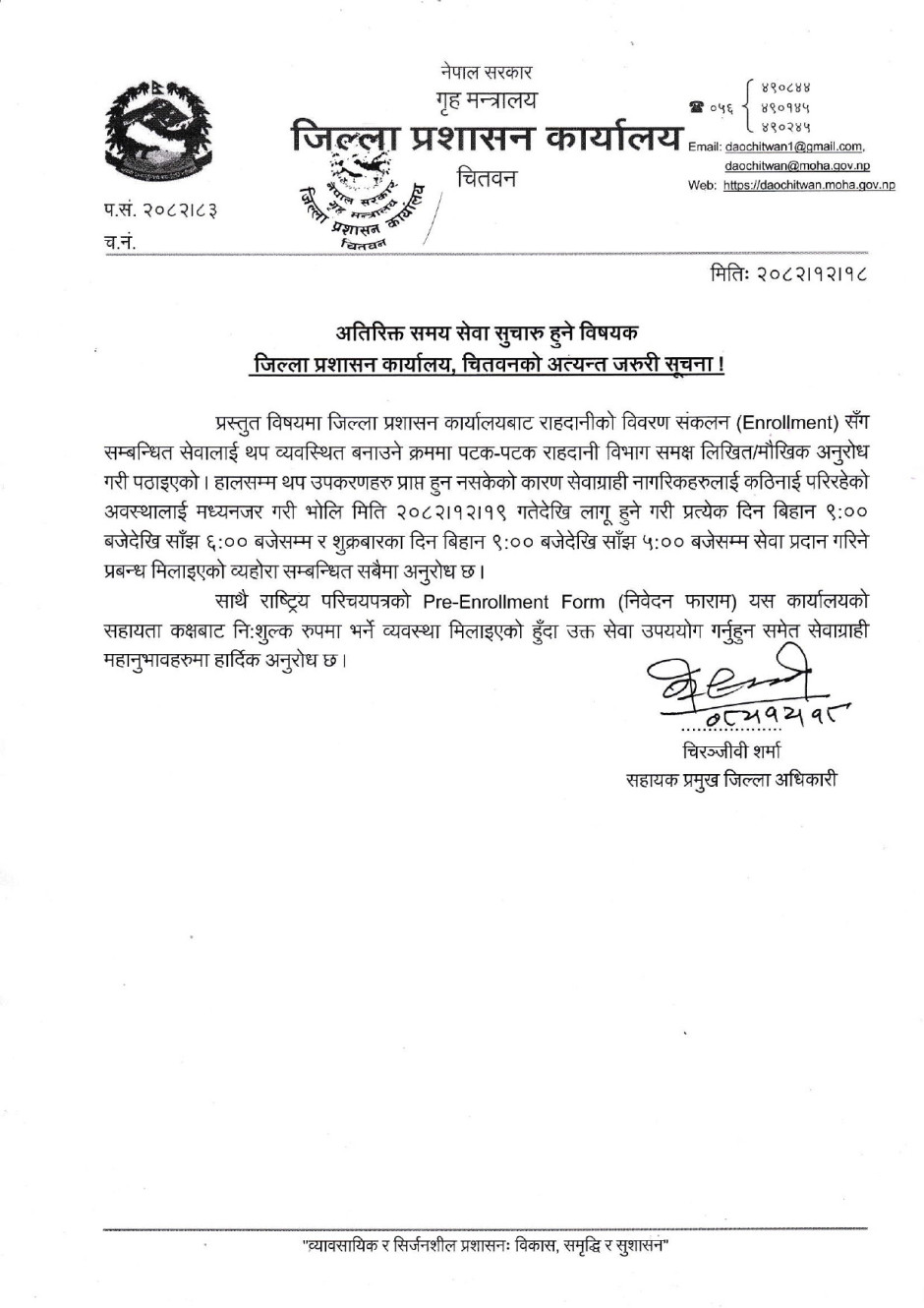 अतिरिक्त समय सेवा सुचारु हुने विषयक जिल्ला प्रशासन कार्यालय, चितवनको अत्यन्त जरुरी सूचना !
