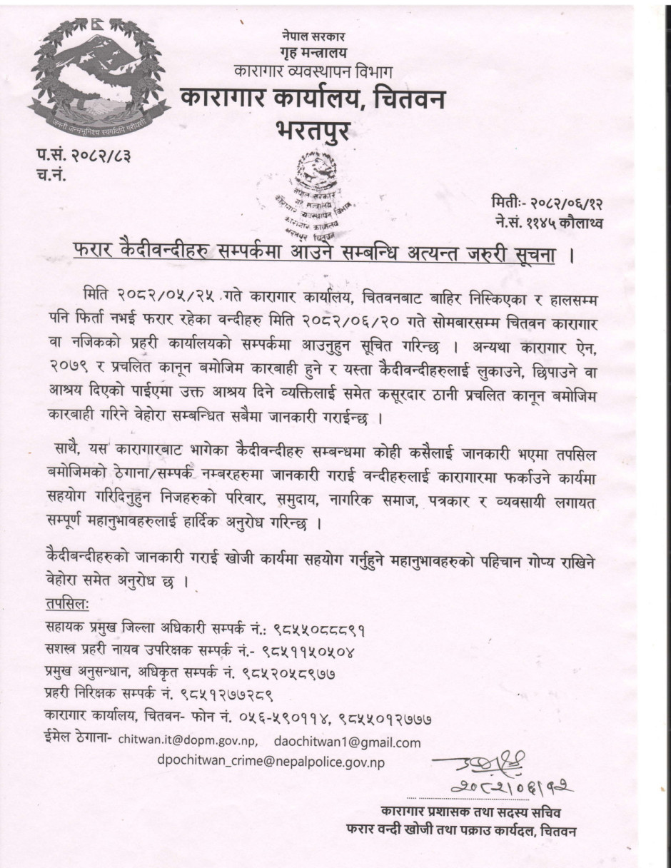 फरार कैदीबन्दी सम्पर्कमा आउने सम्बन्धी कारागार कार्यालय, भरतपुरको सूचना