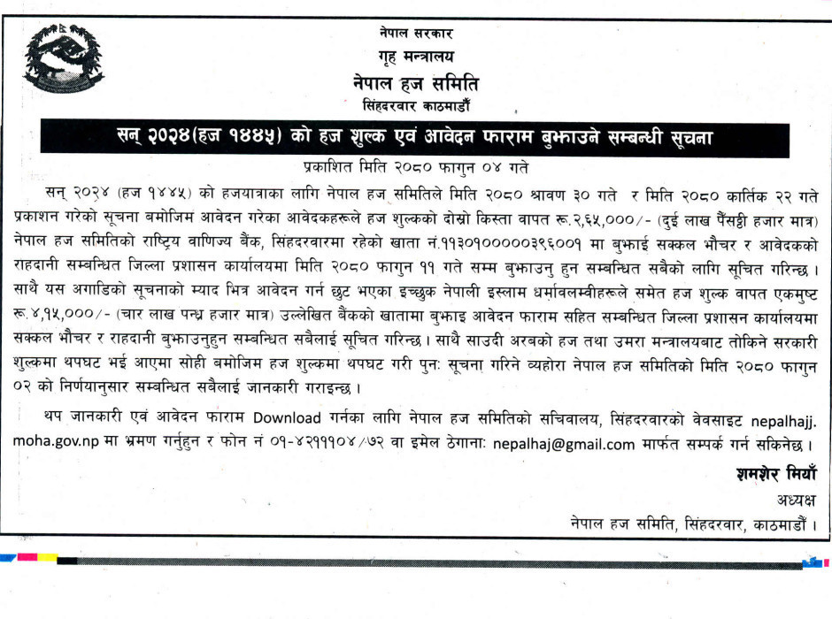 हज शुल्क एवं आवेदन फाराम बुझाउने सम्बन्धी सूचना
