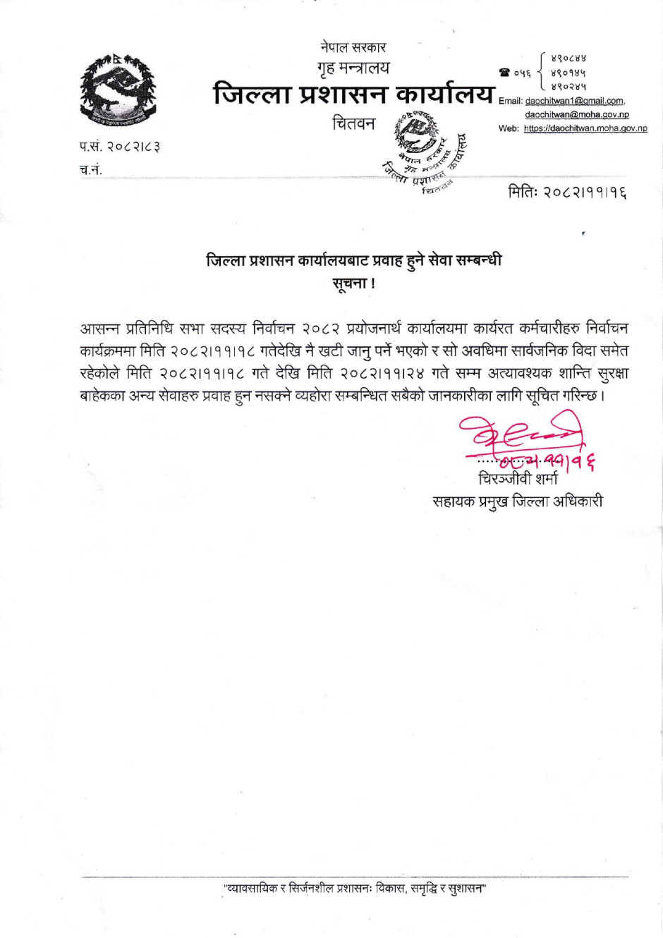 जिल्ला प्रशासन कार्यालय चितवनबाट प्रवाह हुने सेवा सम्बन्धी सूचना !