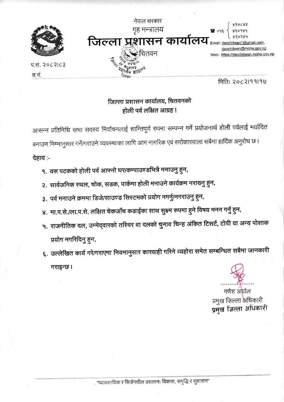 जिल्ला प्रशासन कार्यालय चितवनको होली पर्व लक्षित आग्रह