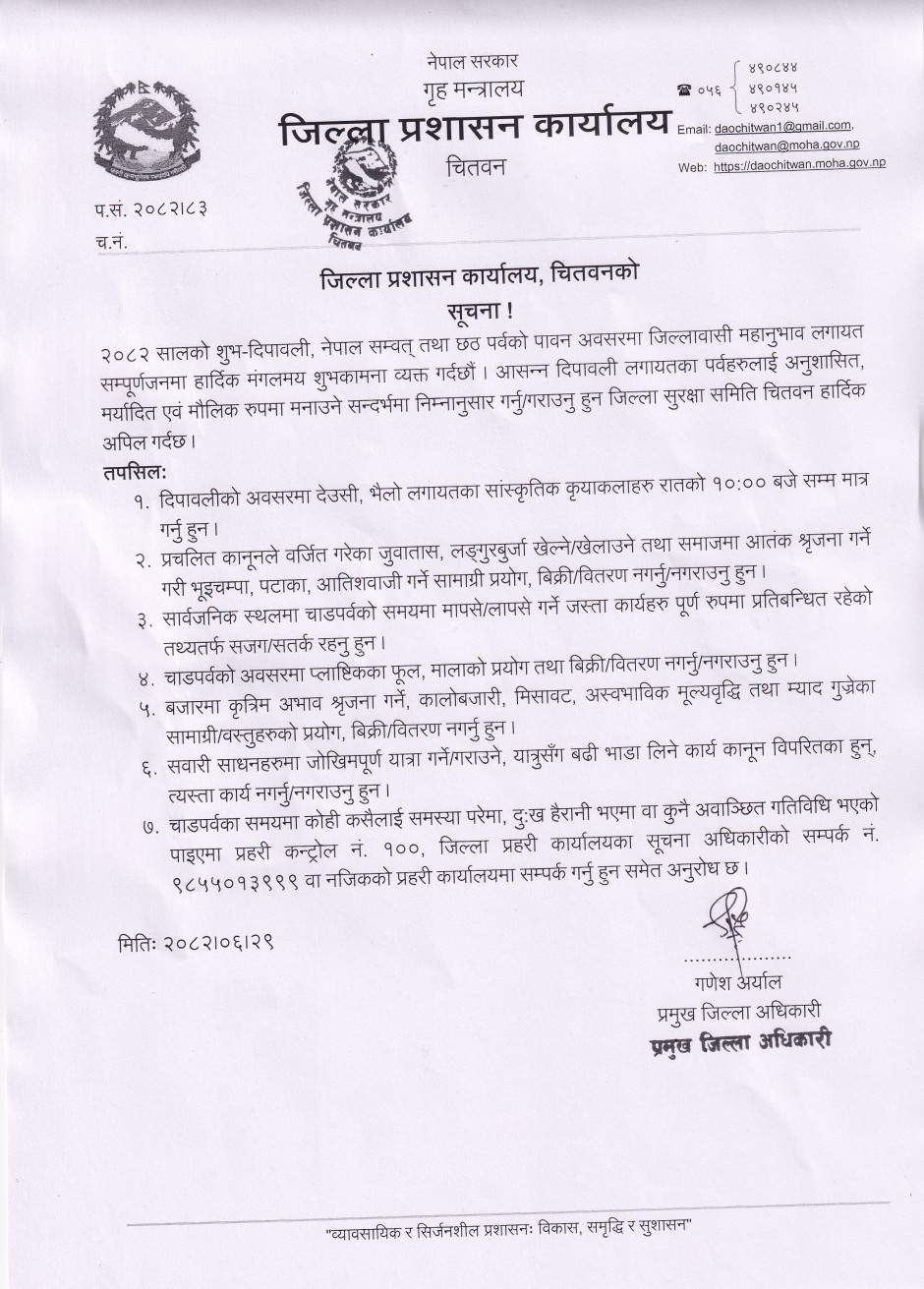 जिल्ला प्रशासन कार्यालय, चितवनको सूचना !