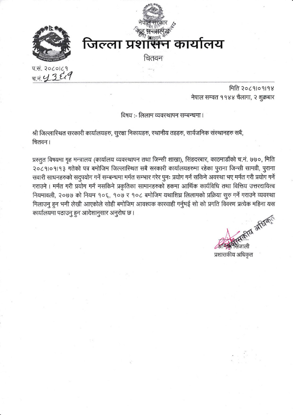 जिल्लास्थित सम्पूर्ण सरकारी कार्यालयहरुका लागि लिलाम व्यवस्थापन सम्बन्धमा परिपत्र