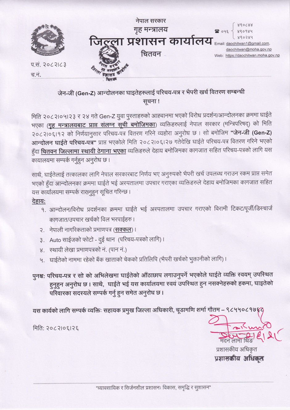 जेन-जी (Gen-Z) आन्दोलनका घाइतेहरुलाई परिचय-पत्र र भैपरी खर्च वितरण सम्बन्धी सूचना !