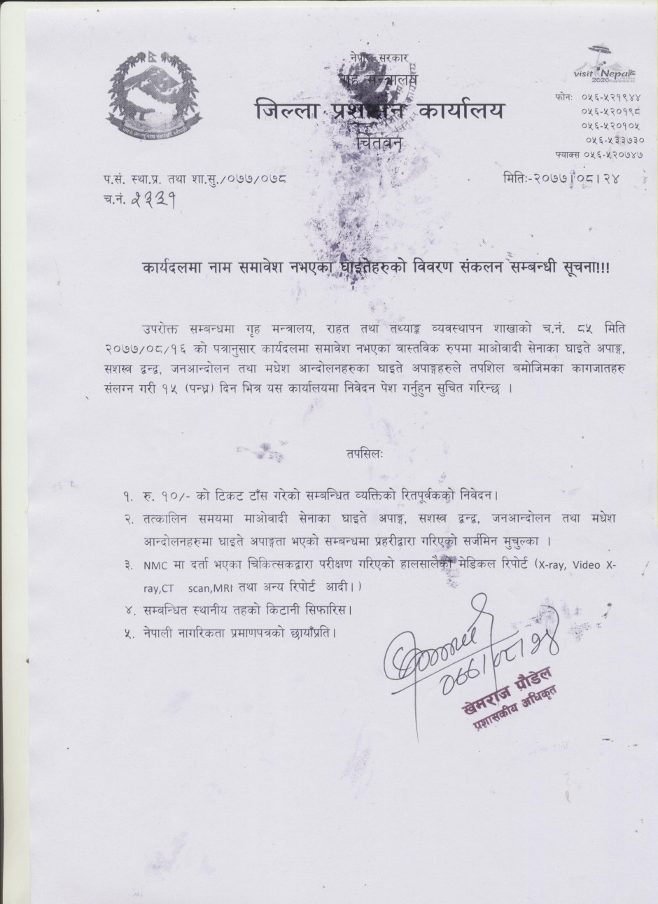 कार्यदलमा नाम समावेश नभएका घाईतेहरुको विवरण संकलन सम्बन्धी सूचना ।