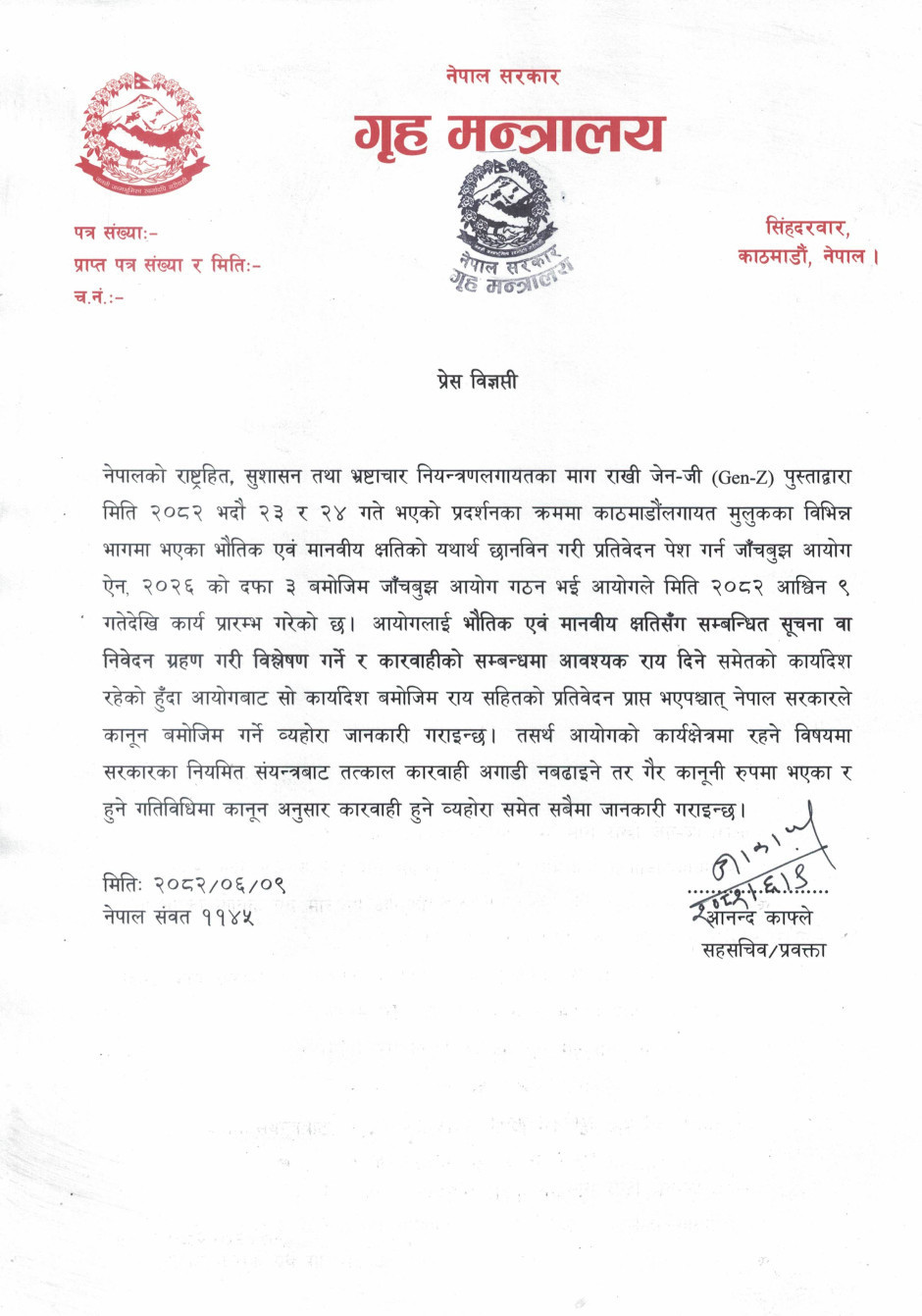 नेपाल सरकार, गृह मन्त्रालयको प्रेस विज्ञप्ती