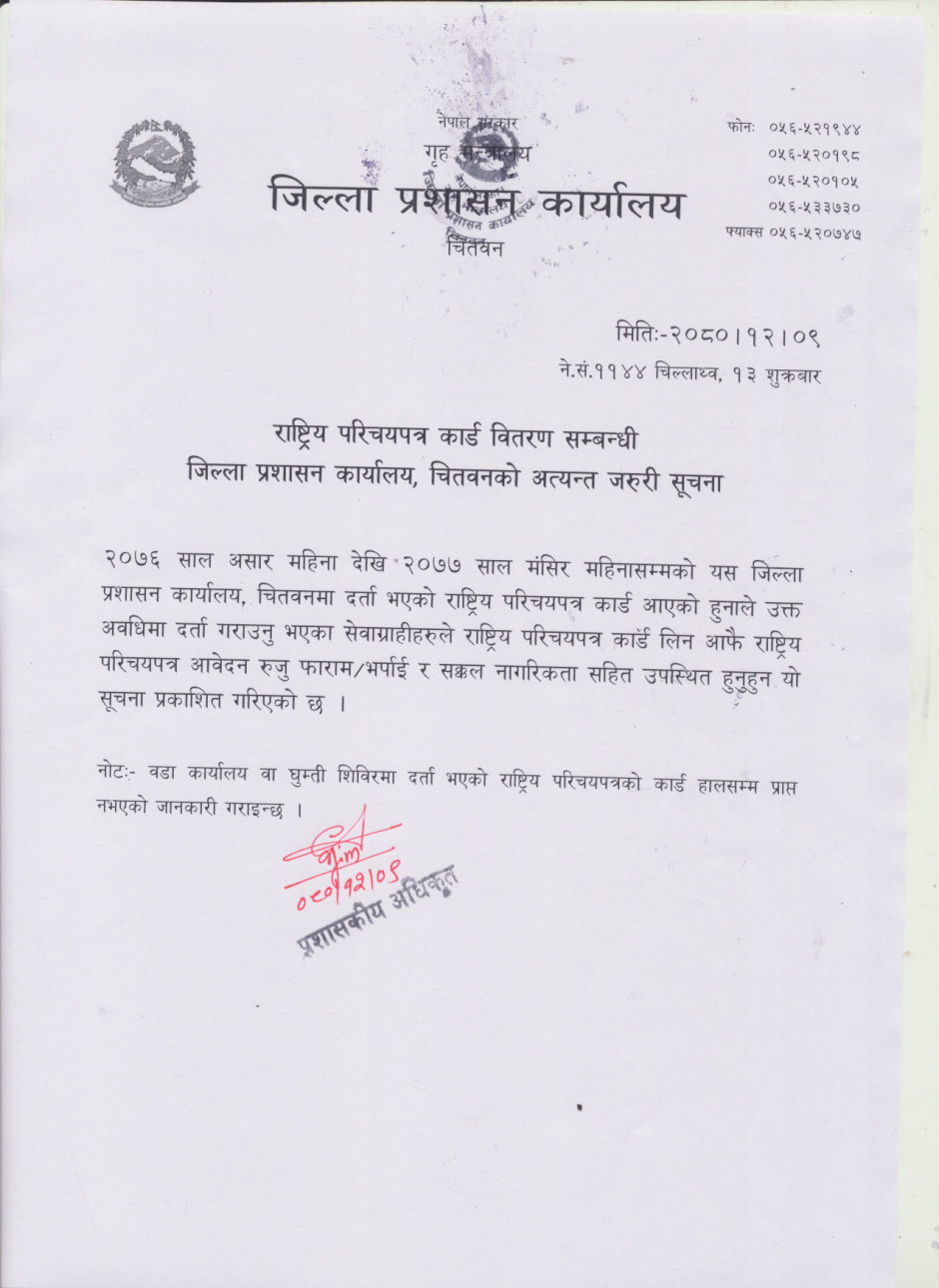 राष्ट्रिय परिचयपत्र कार्ड वितरण सम्बन्धी सूचना