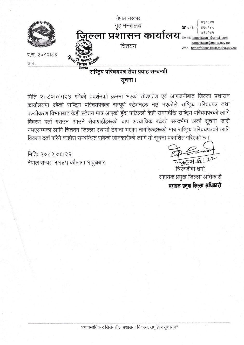 राष्ट्रिय परिचयपत्र सेवा प्रवाह सम्बन्धी सूचना !