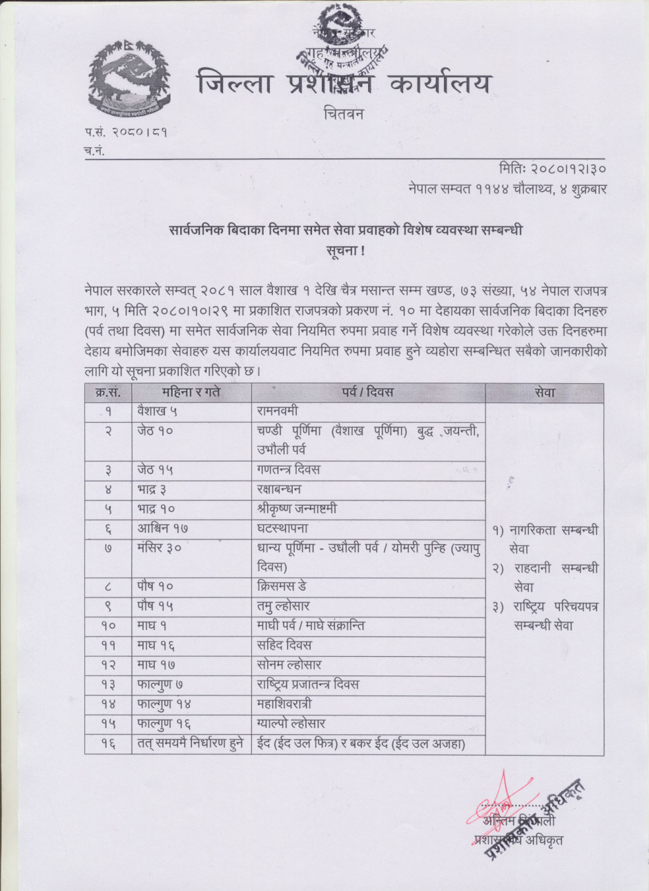 सार्वजनिक बिदाका दिनमा समेत सेवा प्रवाहको विशेष व्यवस्था सम्बन्धी सूचना