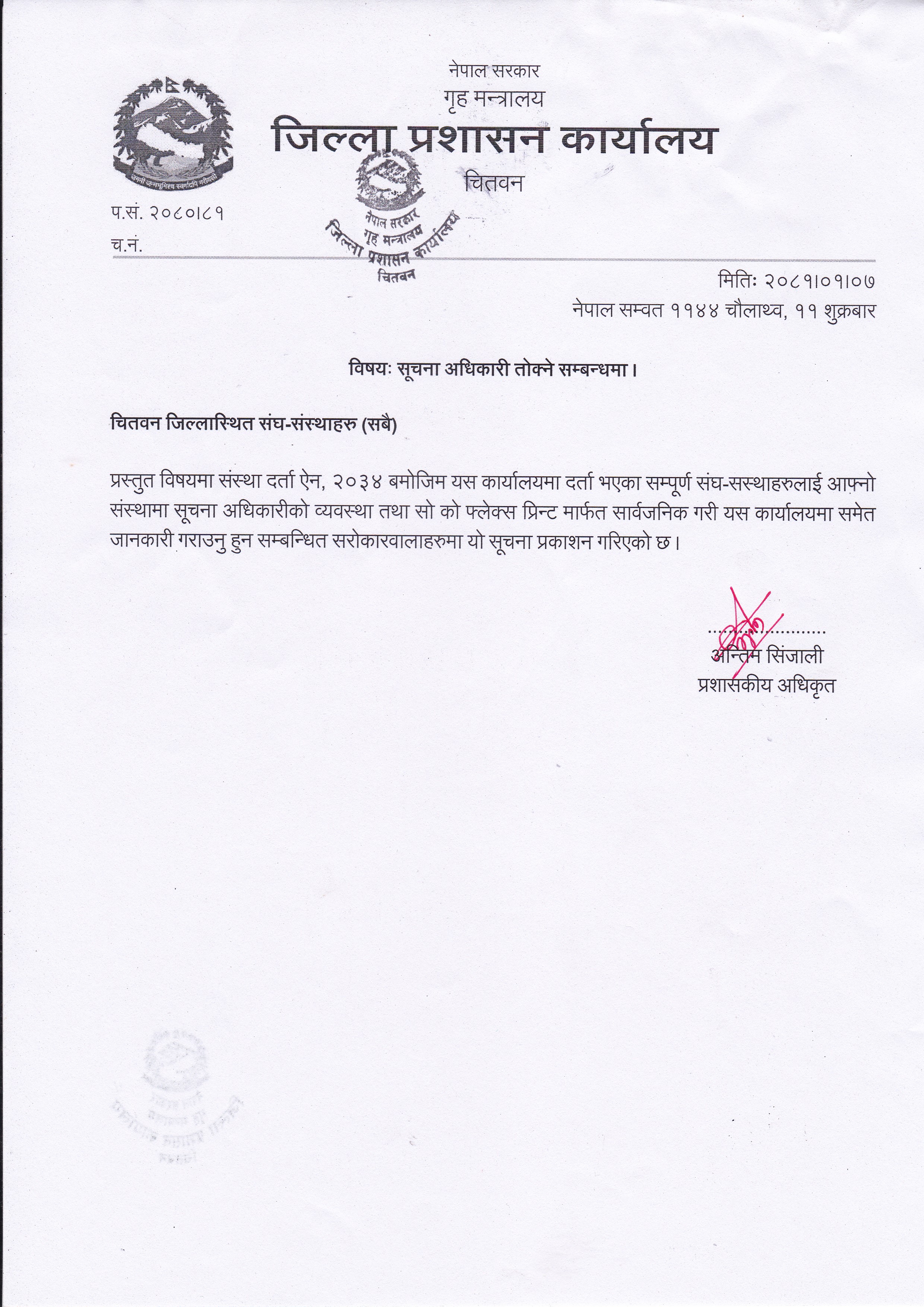 संस्था दर्ता ऐन अनुसार यस कार्यालयमा दर्ता भएका संघ संस्थाहरुका लागि सूचना अधिकारी तोक्ने सम्बन्धमा ।
