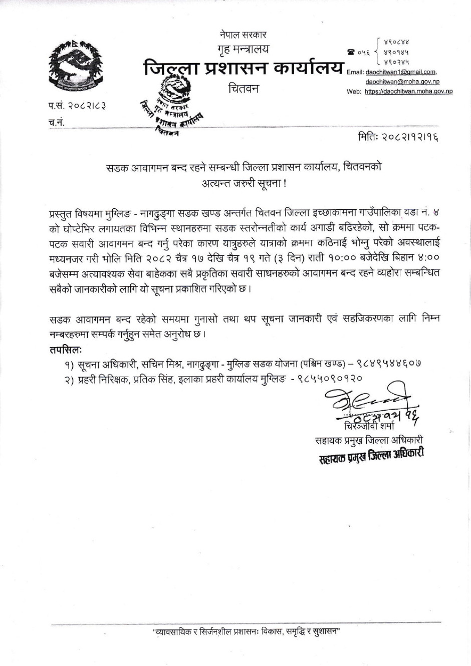 सडक आवागमन बन्द रहने सम्बन्धी जिल्ला प्रशासन कार्यालय, चितवनको अत्यन्त जरुरी सूचना !