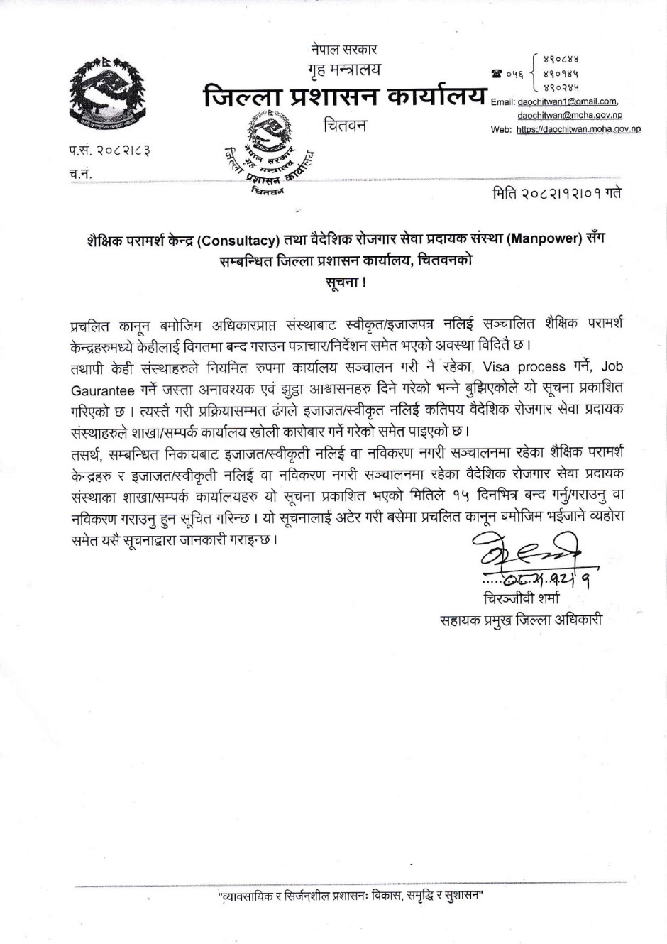 शैक्षिक परामर्श केन्द्र (Consultacy) तथा वैदेशिक रोजगार सेवा प्रदायक संस्था (Manpower) सँग सम्बन्धित जिल्ला प्रशासन कार्यालय, चितवनको सूचना !