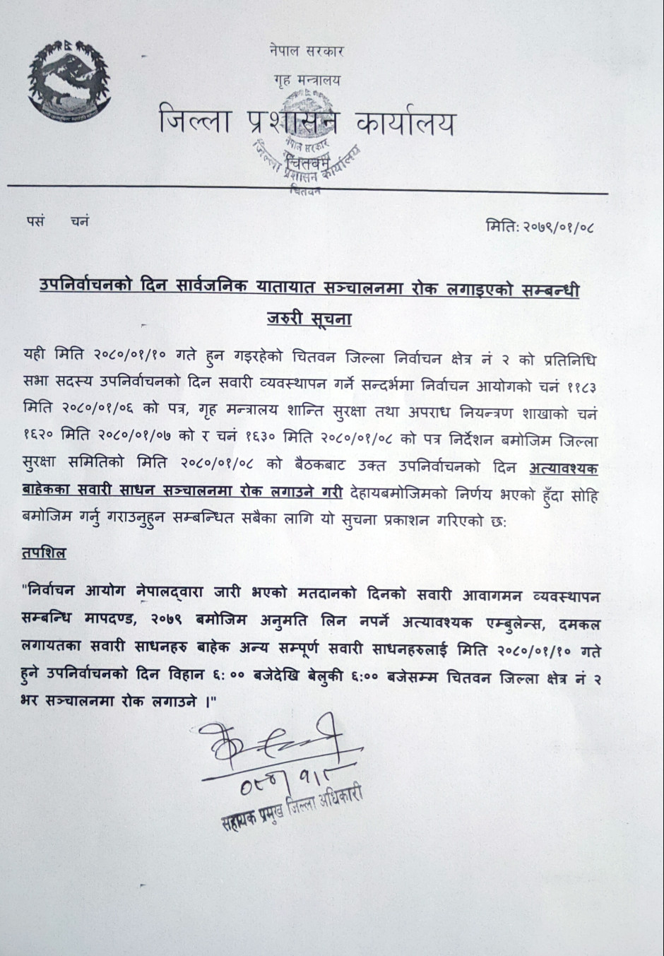 उपनिर्वाचनको दिन सवारी सञ्चालनसम्बन्धि सूचना