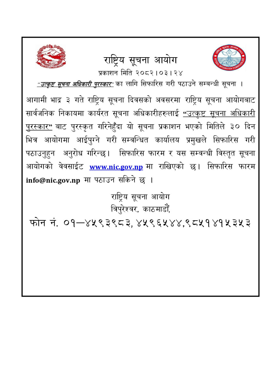 उत्कृष्ट सूचना अधिकारी पुरस्कारका लागि सिफारिस गरी पठाउने सम्बन्धी सूचना !